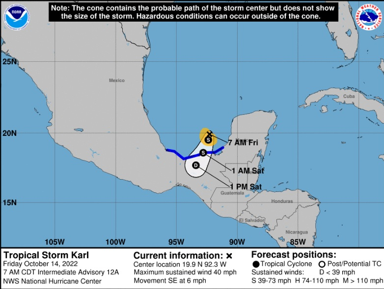 La tormenta tropical "Karl" se aleja de Veracruz y se dirige hacia las costas de Tabasco y Campeche, indica el más reciente pronóstico, informó el meteorólogo Federico Acevedo.