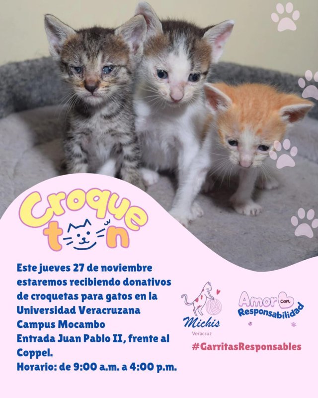Con el objetivo de promover la adopción responsable y apoyar a los gatos rescatados en situación de abandono, estudiantes de la Universidad Veracruzana (UV) llevarán a cabo un Croquetón a beneficio del albergue Salvando Garritas Veracruz, dirigido por la licenciada Leila de los Ángeles Lago Ramírez.