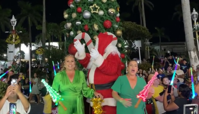 La alcaldesa Lizzette Álvarez Vera en compañía de Santa Claus, fueron los que encendieron el Árbol, a falta de tres semanas para que sea Navidad.