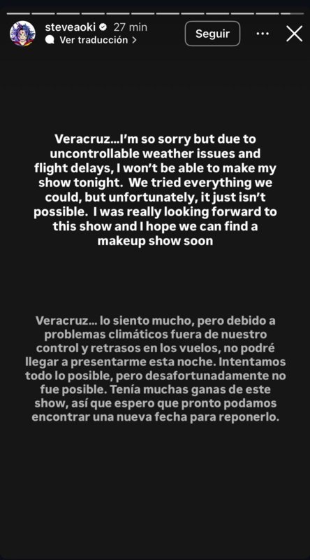 A través de sus historias de Instagram, la cual cuenta con más de 11 millones de seguidores, el nacido en Estados Unidos reveló que por cuestiones climatológicas y retrasos en sus vuelos, no participará en el concierto.