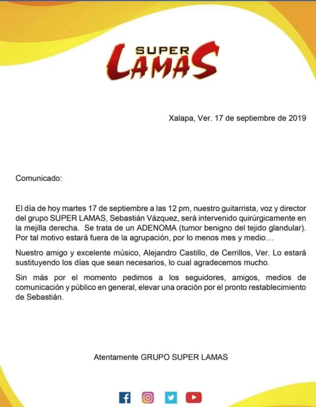 El vocalista y guitarrista del grupo Súper Lamas estará ausente de la banda por un mes y medio por una operación que tuvo el día 17 de septiembre, donde la banda mandó un comnicado explicando el asunto.