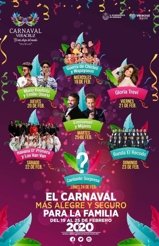 En conferencia de prensa el alcalde de Veracruz, Fernando Yunes Márquez dio a conocer la cartelera artística del Carnaval de Veracruz 2020 que se llevará a cabo del 19 al 25 de febrero.