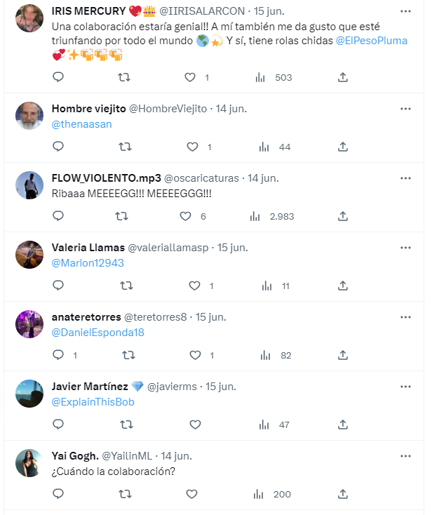 “No había escuchado a Peso Pluma y la verdad si hay unas rolas que están buenazas!! Qué maravilla que le esté yendo tan bien!! Viva México!!”, afirmó el cantante León Larregui, vocalista de Zoe.