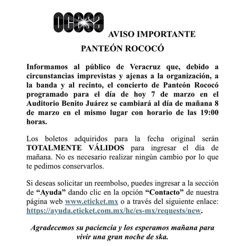 A través de un comunicado se informa que el concierto de Panteón Rococó en Veracruz programado para hoy sábado, se realizará MAÑANA DOMINGO 8 DE MARZO a la misma hora y mismo lugar.