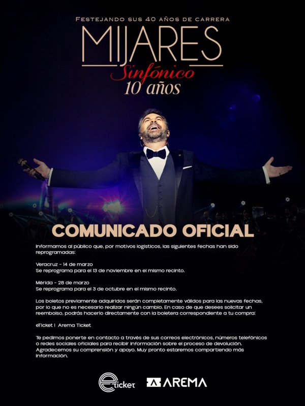 A través de un comunicado se informa que el concierto de Mijares en formato Sinfónico en Veracruz programado para el sábado 14 de marzo, se REPROGRAMA para el VIERNES 13 de NOVIEMBRE, misma hora y mismo recinto.