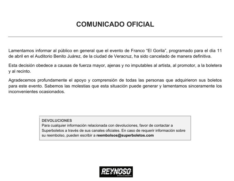 Franco "El Gorila" se presentaría en el Auditorio Benito Juárez del Puerto de Veracruz el sábado 11 de abril, sin embargo: "Por causas de fuerza mayor, ajenas y no imputables al artista, al promotor, a la boletera y al recinto, el concierto ha sido cancelado de manera definitiva", detalla el comunicado.