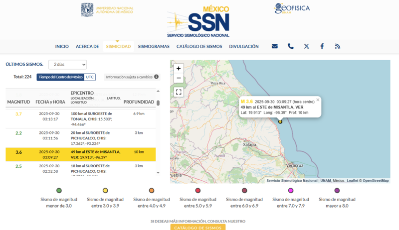 A través de su página web, escribió: “M 3.6 2025-09-30 03:09:27 (hora centro) 49 km al ESTE de MISANTLA, VER Lat: 19.913° Long: -96.39° Prof: 10 km”