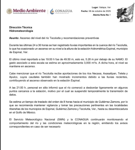 Agregó que durante las últimas 24 a 36 horas, se han registrado lluvias importantes en la cuenca del Río Tecolutla, lo que ha ocasionado un ascenso en su nivel a la altura de la estación del municipio de Espinal.