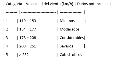 Se clasifica según la Escala Saffir-Simpson (categorías 1 a 5):