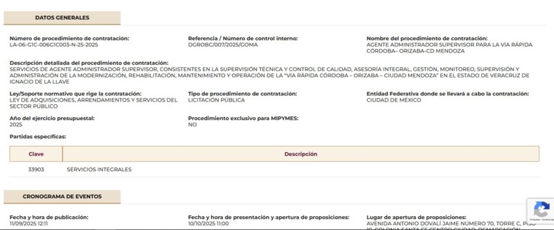 La Secretaría de Infraestructura, Comunicaciones y Transportes (SICT) lanzó una la licitación pública nacional, para contratar los servicios de Agente Administrador Supervisor (AAS) para la instalación de casetas en la vía rápida Córdoba–Orizaba–Ciudad Mendoza.