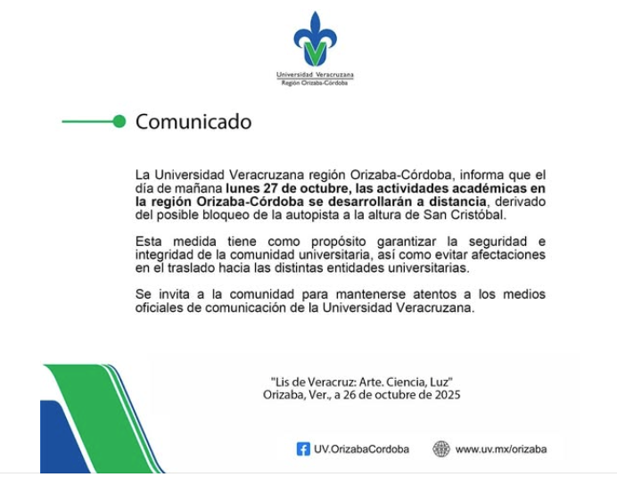 La Universidad Veracruzana, región Orizaba-Córdoba, informa que este lunes 27 de octubre, las actividades académicas en la región Orizaba-Córdoba se desarrollarán a distancia, derivado del posible bloqueo de la autopista a la altura de San Cristóbal.
