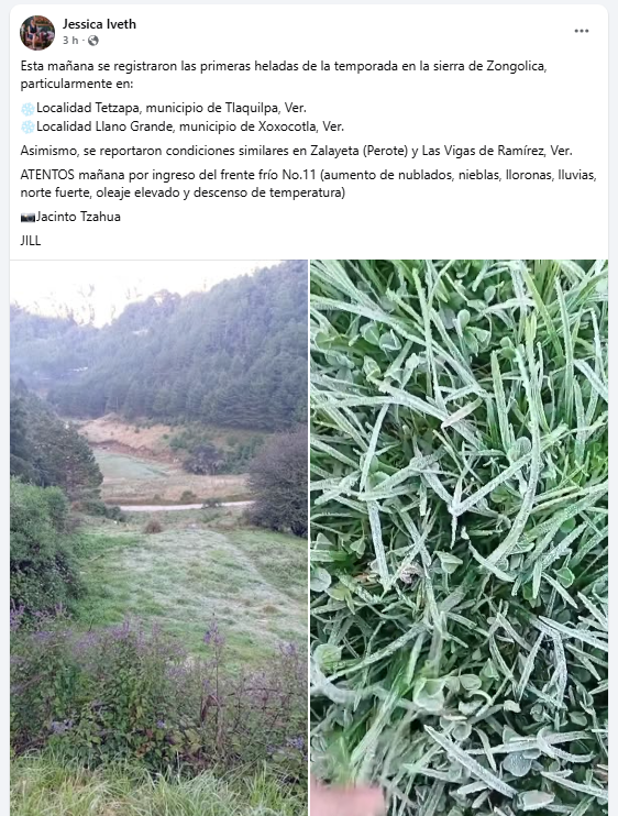 La mañana se registraron las primeras heladas de la temporada en la sierra de Zongolica, reportó la jefa de Hidrometeorología de la Comisión Nacional del Agua (Conagua), Jessica Luna.