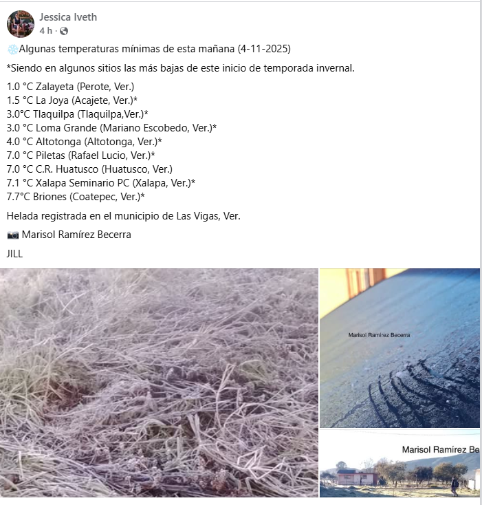 Las temperaturas más bajas registradas este martes 4 de noviembre se registraron en las localidades de Zalayeta, municipio de Perote, Veracruz, con 1.0 °C, y en La Joya, con 1.5 °C, informó Jessica Luna, jefa de Hidrometeorología de la Comisión Nacional del Agua (Conagua).