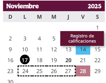 Los días marcados con suspensión de clases son el viernes 14 de noviembre, el cual está marcado como día de "Registro de calificaciones", mientras que el lunes 17 es el día feriado de corrimiento por el 20 de noviembre, Día de la Revolución Mexicana.
