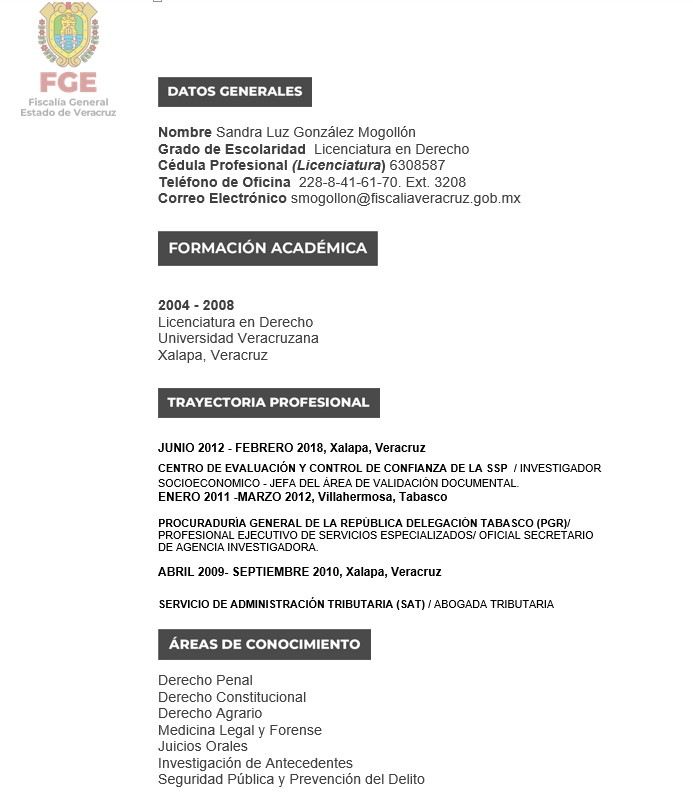 Sandra Luz González labora actualmente en la Fiscalía General del Estado de Veracruz (FGEV) , es licenciada en Derecho, por la Universidad Veracruzana y también es investigadora del Centro de Control de Confianza de la Secretaría de Seguridad Pública de Veracruz.