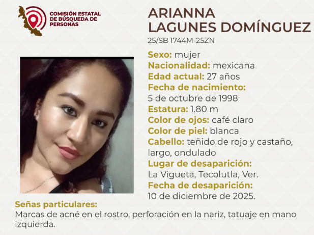 La segunda persona reportada como desaparecida es Arianna Lagunes Domínguez, de 27 años de edad, ella desapareció el 10 de diciembre en La Vigueta, municipio de Tecolutla.