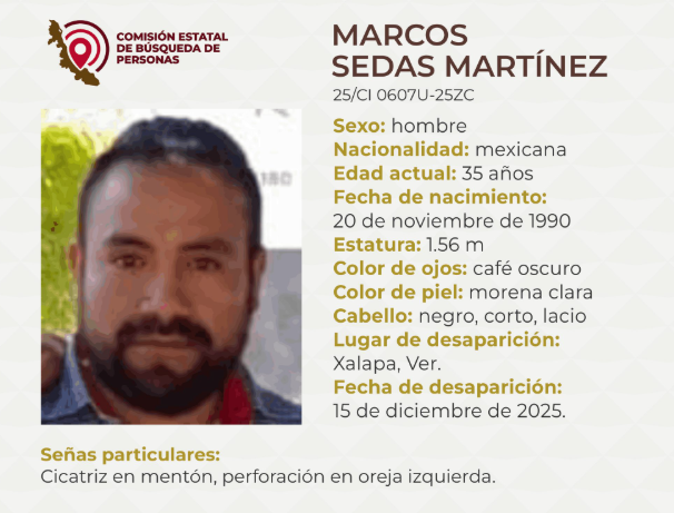La tercera persona reportada como desaparecida es Marcos Sedas Martínez, de 35 años, él fue visto por última vez en Xalapa el 15 de diciembre. Es de ojos cafés oscuros, pelo negro corto, piel morena clara y de señas particulares tiene una cicatriz en el mentón y perforación de la oreja izquierda.