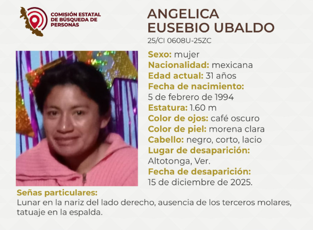 También buscan a Angélica Eusebio Ubaldo de 31 años, ella desapareció en Altotonga el 15 de diciembre. Como señas particulares tiene un lunar en la nariz del lado derecho y tatuaje en la espalda.