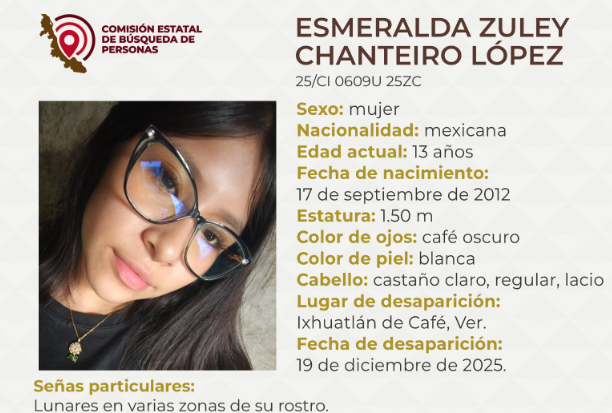 Entre las personas desaparecidas también está la joven Esmeralda Zuley Chanteiro López de 13 años, ella desapareció el 19 de diciembre en Ixhuatlán del Café, mide 1.50 metros de estatura, es de piel blanca, cabello castaño claro. Como señas particulares tiene lunares en el rostro.