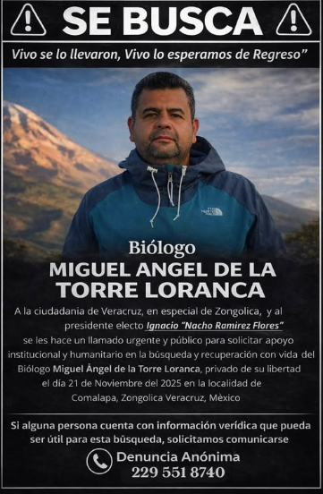 Hoy, 8 de enero de 2026, mientras deberíamos estar celebrando el cumpleaños de Miguel Ángel de la Torre Loranca, nuestro esposo, padre, biólogo y asesor ambientalista, en cambio estamos viviendo la angustia de su secuestro en Zongolica.