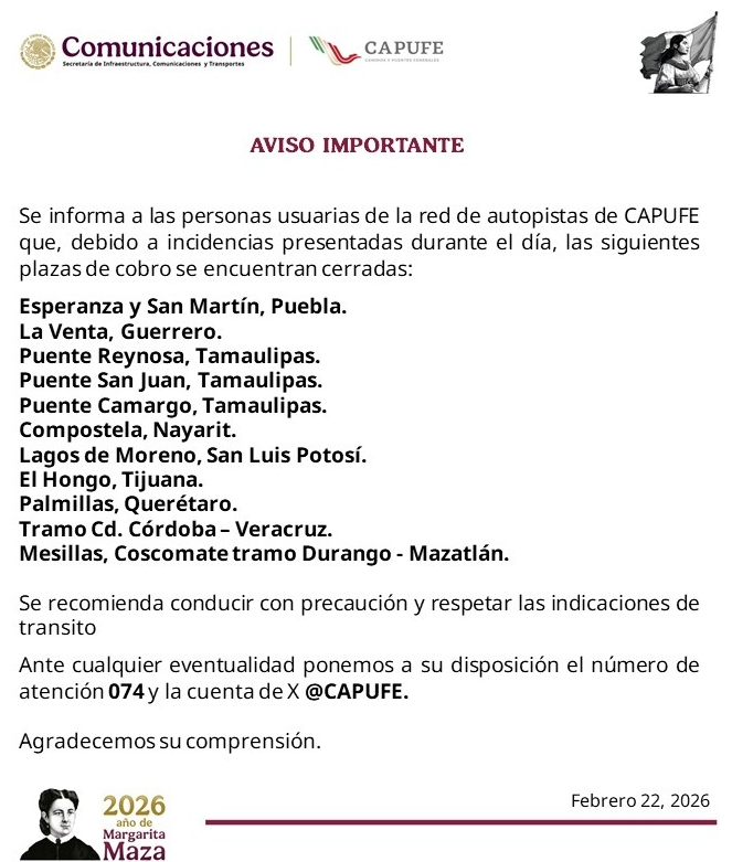 Caminos y Puentes Federales (Capufe) informó este domingo 22 de febrero el cierre de varias casetas de cobro ante los hechos de violencia registrados en autopistas del país tras la caída del líder delictivo "El Mencho".