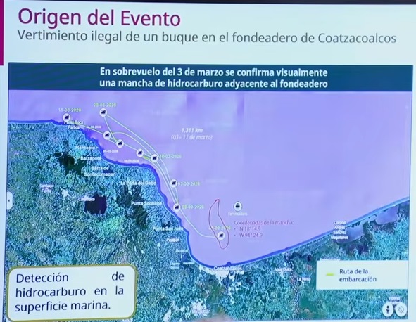 En rueda de prensa, el secretario de Marina, Raymundo Pero Morales Ángeles, reveló que se identificó que un buque que hizo un vertimiento ilegal de petróleo en un fondeadero del puerto de Coatzacoalcos.