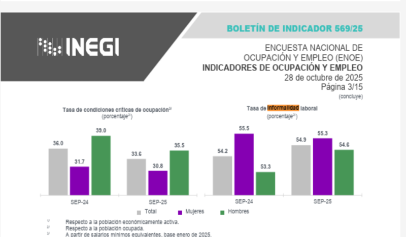 Los trabajadores informales en septiembre totalizaron 33,1 millones, lo que aumentó la tasa de informalidad al 54,9%; en igual mes de 2024, fue de 54.2%, reportó este martes el Instituto Nacional de Estadística y Geografía (INEGI).