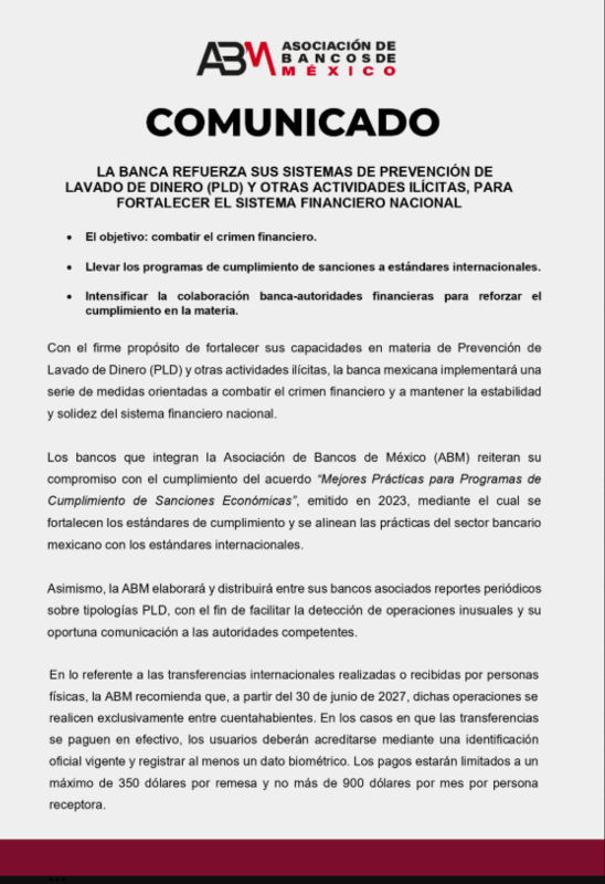 En un comunicado, la Asociación Nacional de Bancos de México (ABM) destacó que con el firme propósito de fortalecer sus capacidades en materia de Prevención de Lavado de Dinero (PLD) y otras actividades ilícitas, la banca mexicana implementará una serie de medidas orientadas a combatir el crimen financiero y a mantener la estabilidad y solidez del sistema financiero nacional.