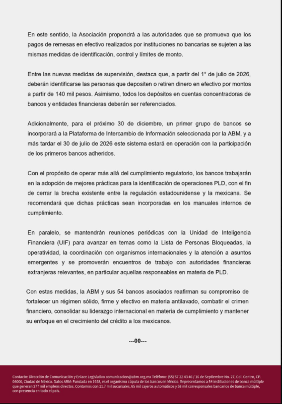 Entre las nuevas medidas de supervisión, destaca que, a partir del 1° de julio de 2026, deberán identificarse las personas que depositen o retiren dinero en efectivo por montos a partir de 140 mil pesos. Asimismo, todos los depósitos en cuentas concentradoras de bancos y entidades financieras deberán ser referenciados.