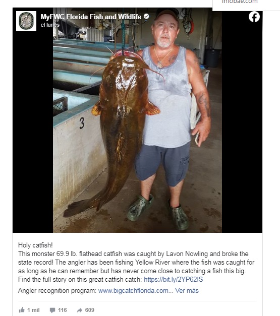 Un pescador atrapó un bagre de 1,2 metros y 31,7 kilogramos, batiendo con ello el récord del estado de Florida, informó el Departamento de Pesca y Vida Silvestre de ese territorio de Estados Unidos.