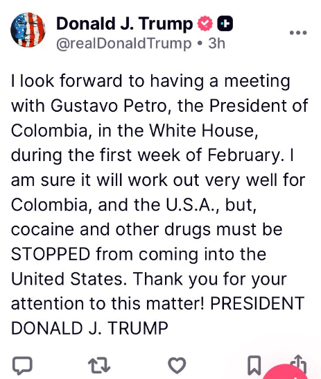 "Espero reunirme con Gustavo Petro, presidente de Colombia, en la Casa Blanca, durante la primera semana de Febrero. Estoy seguro que funcionará muy bien para Colombia y para Estados Unidos", dijo en su post.