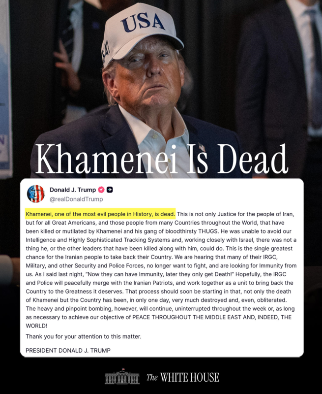 Trump afirma que el ayatolá Ali Jameneí murió tras ataque a Irán