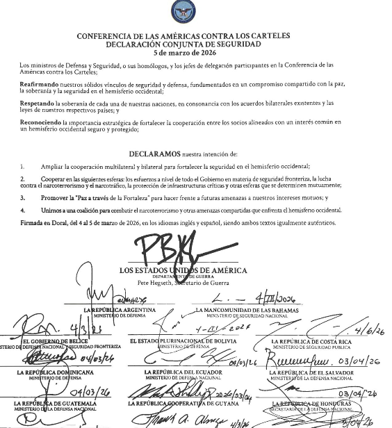 El presidente de Estados Unidos, Donald Trump, formalizó este sábado la creación de una coalición militar junto a presidentes latinoamericanos para derrotar a los carteles, en la que no participa México, en medio de la tensión por un posible ataque estadounidense contra el narcotráfico en territorio mexicano.