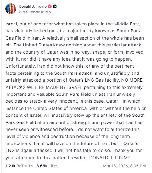 En una publicación donde Trump se desliga del ataque indicó que: "Israel, enfurecido por lo ocurrido en Oriente Medio, atacó una importante instalación en Irán conocida como el campo de gas Pars Sur. Solo una pequeña parte resultó dañada".