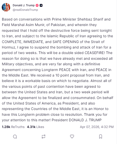 “Casi todos los puntos de conflicto del pasado han sido acordados”, indicó Trump, al tiempo que expresó que este periodo de dos semanas permitirá concretar un pacto enfocado en la paz a largo plazo tanto con Irán como en la región de Medio Oriente.