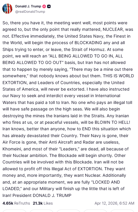 En ese contexto, advirtió que la Armada de Estados Unidos iniciaría acciones para bloquear el paso de embarcaciones en la zona, así como inspeccionar e interceptar buques en aguas internacionales, especialmente aquellos que, según afirmó, hayan pagado algún tipo de “peaje” a Irán.