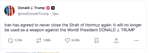 “IRAN acaba de anunciar que el estrecho de Ormuz está completamente abierto y listo para el paso libre. ¡Gracias!", escribió el republicano.