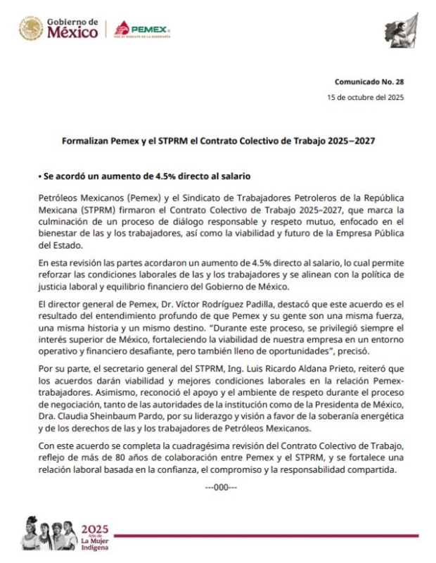 Petróleos Mexicanos (Pemex) y el Sindicato de Trabajadores Petroleros de la República Mexicana formalizaron el Contrato Colectivo de Trabajo 2025-2027. En la revisión se acordó un aumento de 4.5% directo al salario, con el objetivo de fortalecer las condiciones laborales y mantener el equilibrio financiero.
