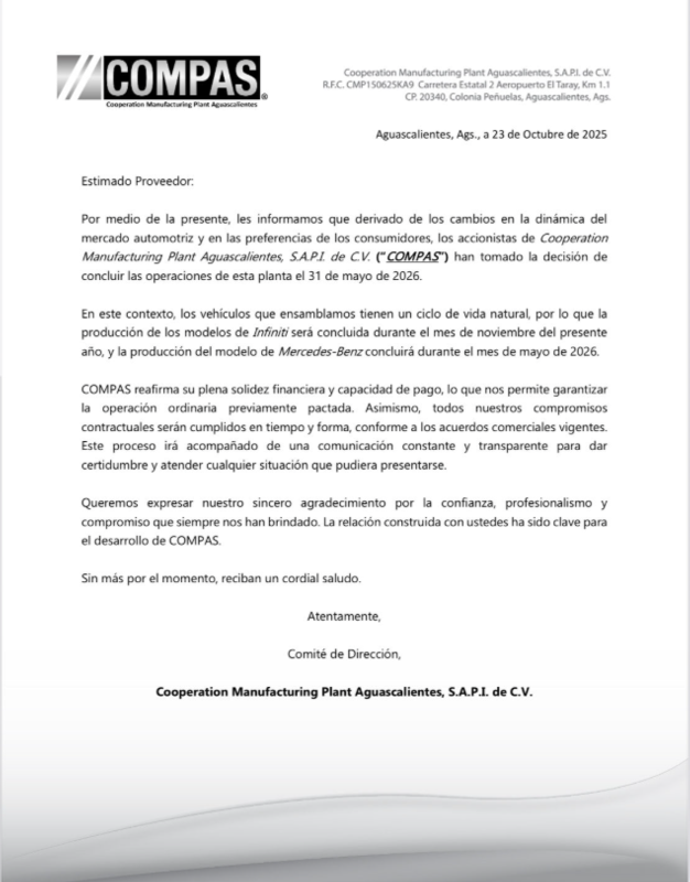 La empresa emitió el siguiente comunicado en el que detalla que "derivado de los cambios en la dinámica del mercado automotriz y en las preferencias de los consumidores, los accionistas de Cooperation Manufacturing Plant Aguascalientes, S.A.P.I. de C.V. ("COMPAS") han tomado la decisión de concluir las operaciones de esta planta el 31 de mayo de 2026.