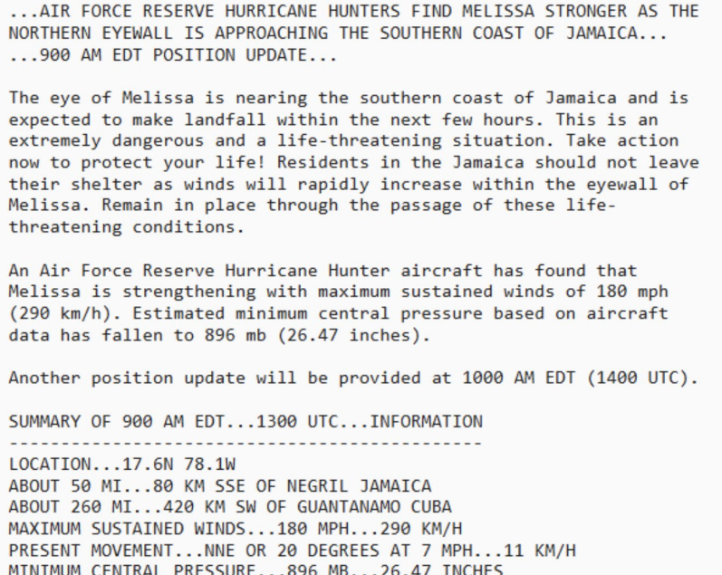 “Un avión cazahuracanes de la Reserva de la Fuerza Aérea ha detectado que Melissa se está fortaleciendo con vientos máximos sostenidos de 290 km/h (180 mph). La presión central mínima estimada, basada en datos de la aeronave, ha descendido a 896 mb (26,47 pulgadas)”, detallan.