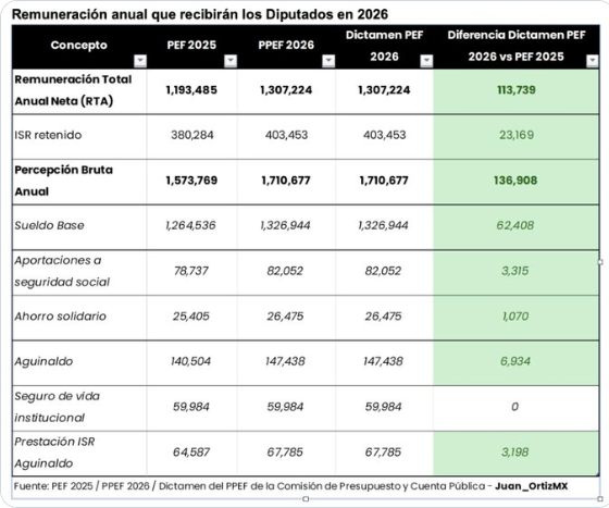 De acuerdo con publicación de Excélsior, el proyecto de dictamen del PEF 2026 contempla que los diputados federales podrán disponer de una bolsa superior a los 653, 612 millones de pesos para su salario neto en 2026 y el aumento contemplado es de 113, 739 mil pesos para cada uno de los 500 legisladores, por lo que su ingreso anual pasará de un millón 193 mil 485 pesos a un millón 307 mil 224 pesos netos.