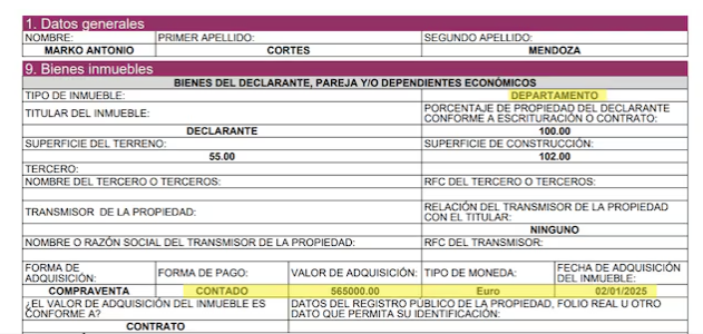El portal FrojiMX reveló que Marko Cortés registró la adquisición del inmueble el pasado 21 de mayo, cuando presentó su declaración patrimonial ante la Contraloría Interna del Senado de la República, sin especificar en qué lugar de Europa.