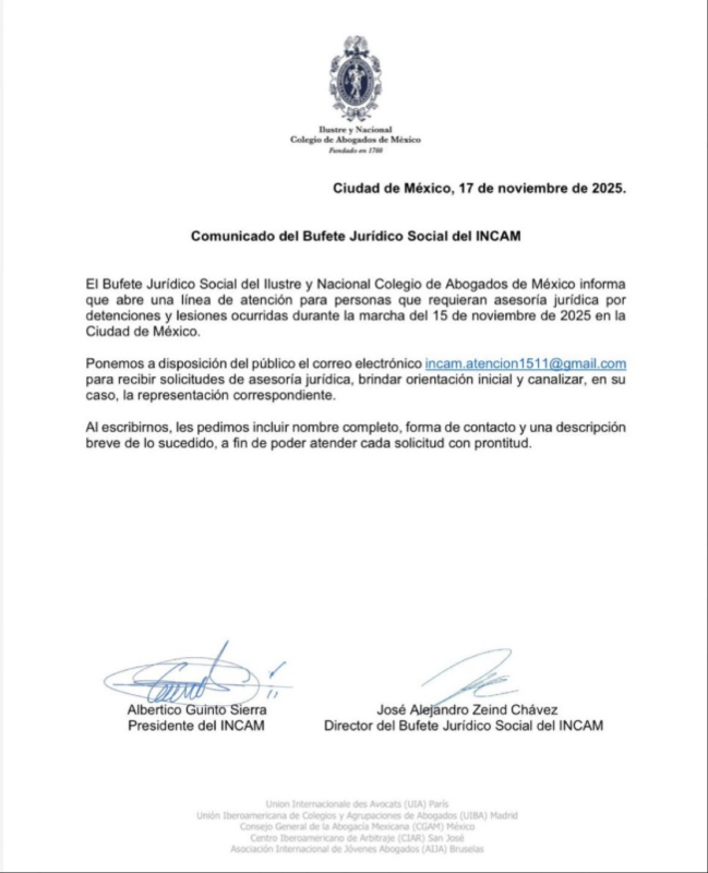 El Ilustre y Nacional Colegio de Abogados de México anunció que abrirá una línea de atención gratuita para ayudar a todas las personas que fueron detenidas tras la realización de la marcha convocada por la Generación Z, el pasado sábado en el zócalo de la Ciudad de México.