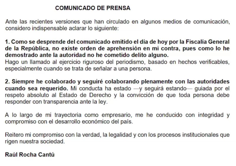 Reitero mi compromiso con la verdad, la legalidad y con los procesos institucionales que rigen nuestra sociedad. Raúl Rocha Cantú”.