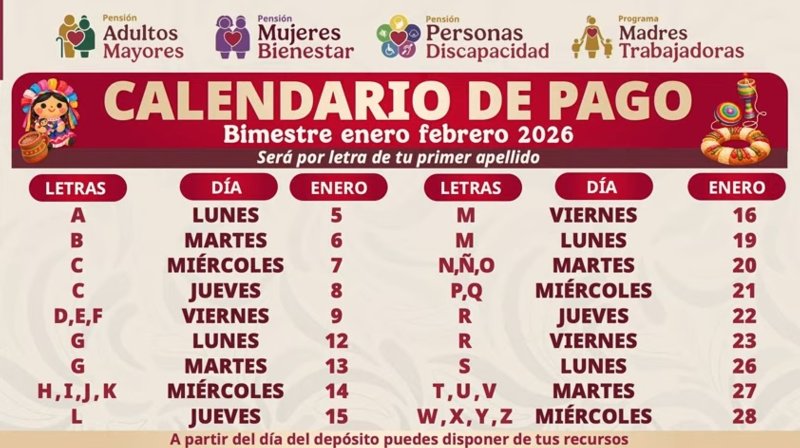 Del 5 al 28 de enero de pagarán los apoyos de Pensión de Adultos Mayores, Pensión Mujeres Bienestar y Pensión para personas con Discapacidad, correspondiente al bimestre enero - febrero.