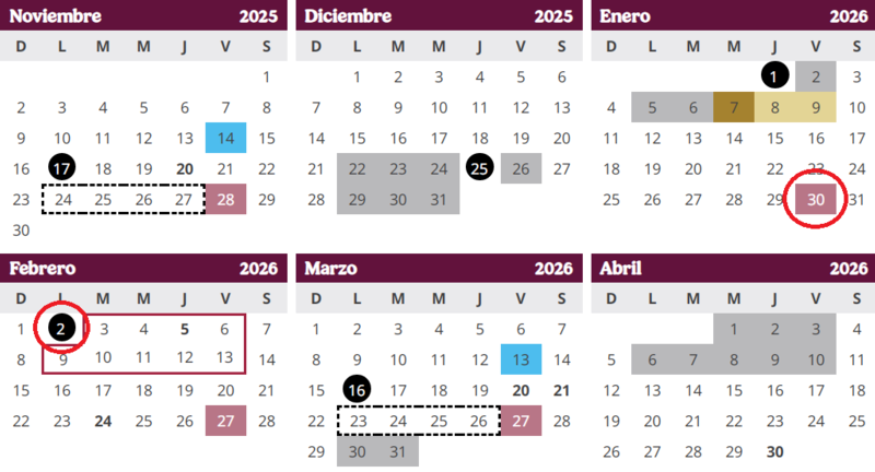 El descanso para los alumnos se extiende sábado y domingo, pero continúa el lunes 2 febrero, marcado como suspensión de labores docentes debido a que se recorre el festivo del día 5 de febrero, fecha en que se conmemora la promulgación de la Constitución.