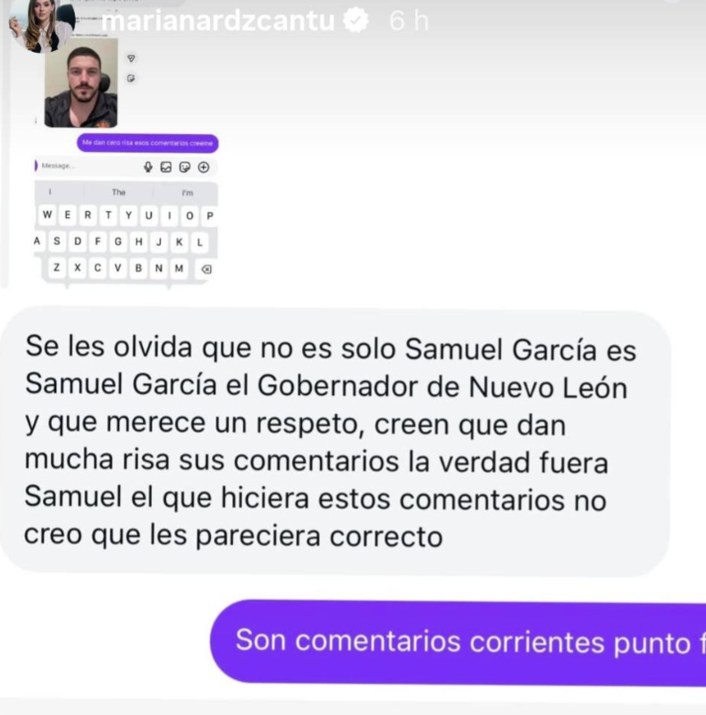 “Se les olvida que no es solo Samuel García es Samuel García el Gobernador de Nuevo León y que merece un respeto, creen que dan mucha risa sus comentarios la verdad fuera Samuel el que hiciera estos comentarios no creo que les pareciera correcto”, escribió en sus redes Mariana Rodríguez.