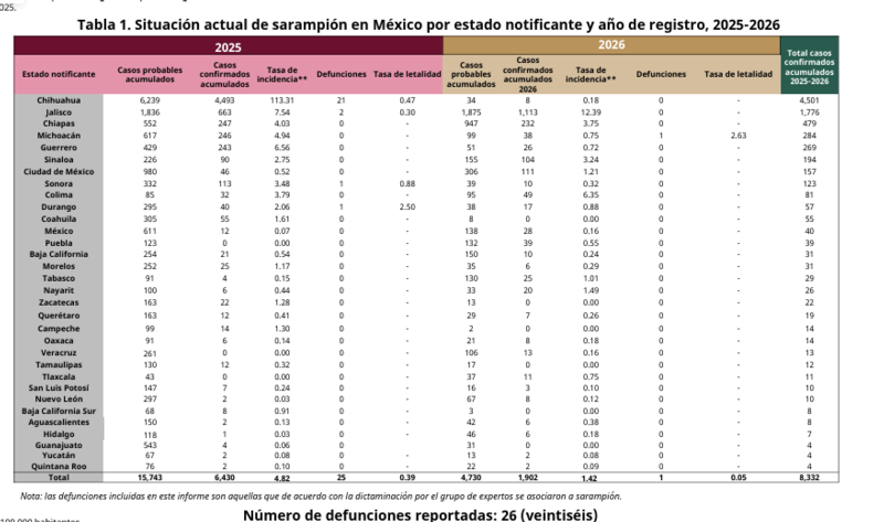 Al día de hoy miércoles 4 de enero, se han reportado 8,332 casos acumulados de sarampión; en las últimas 24 horas se reportaron 44casos, informó la Secretaría de Salud en su Informe Diario del Brote de Sarampión en México 2026, con corte el 3 de febrero.