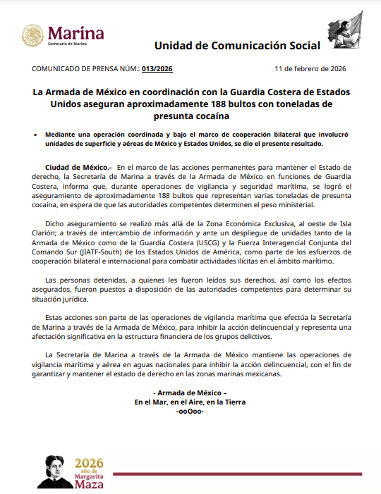 El decomiso ocurrió más allá de la Zona Económica Exclusiva, al oeste de Isla Clarión, en Colima, como resultado de un operativo coordinado que incluyó el intercambio de información y el despliegue de unidades navales mexicanas, así como de la Guardia Costera de Estados Unidos (USCG) y la Fuerza Interagencial Conjunta del Comando Sur (JIATF-South), en el marco de la cooperación bilateral para combatir actividades ilícitas en el ámbito marítimo.