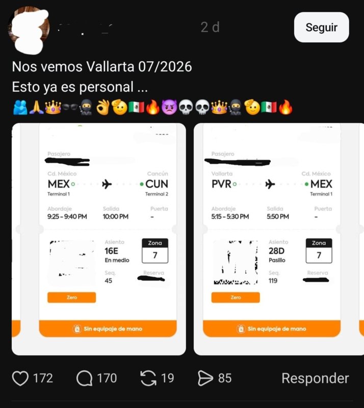 De acuerdo con la publicación, realizada el pasado viernes 13 de febrero por el usuario @cooper_****, compartió dos imágenes de sus boletos con destino a Cancún y Puerto Vallarta, sin ocultar datos sensibles como su nombre completo y el número de reservación.